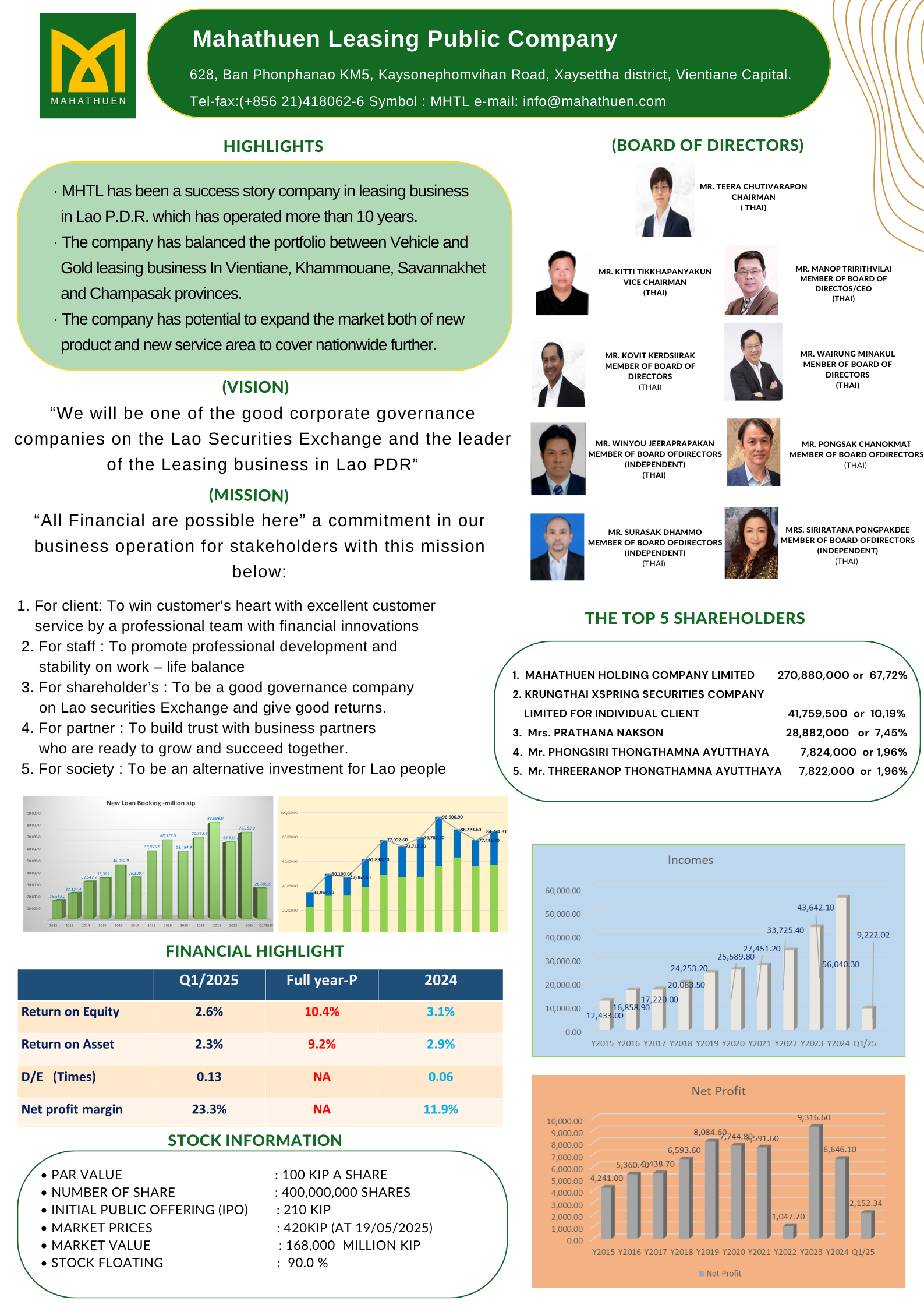 เชิญเข้าร่วมงานสัมมนาภายใต้หัวข้อ “บริษัทจดทะเบียนพบปะผู้ลงทุน Opportunity Day” จุดประสงค์ เพื่อเปิดโอกาสให้ผู้ลงทุนที่สนใจ สามารถเข้าร่วมรับฟัง แลกเปลี่ยนและสอบถามข้อมูลสำคัญเกี่ยวกับบริษัทจดทะเบียน ซึ่งบริษัทมะหะทุน เช่าสินเชื่อ มหาชน นำเสนอในวันพฤหัสฯ ที่ 29 พฤษภาคม 2568 เวลา 13.30 - 14.55 สามารถรับชมผ่านการถ่ายทอดสดผ่านทาง Facebook ของตลาดหลักทรัพย์ลาว.