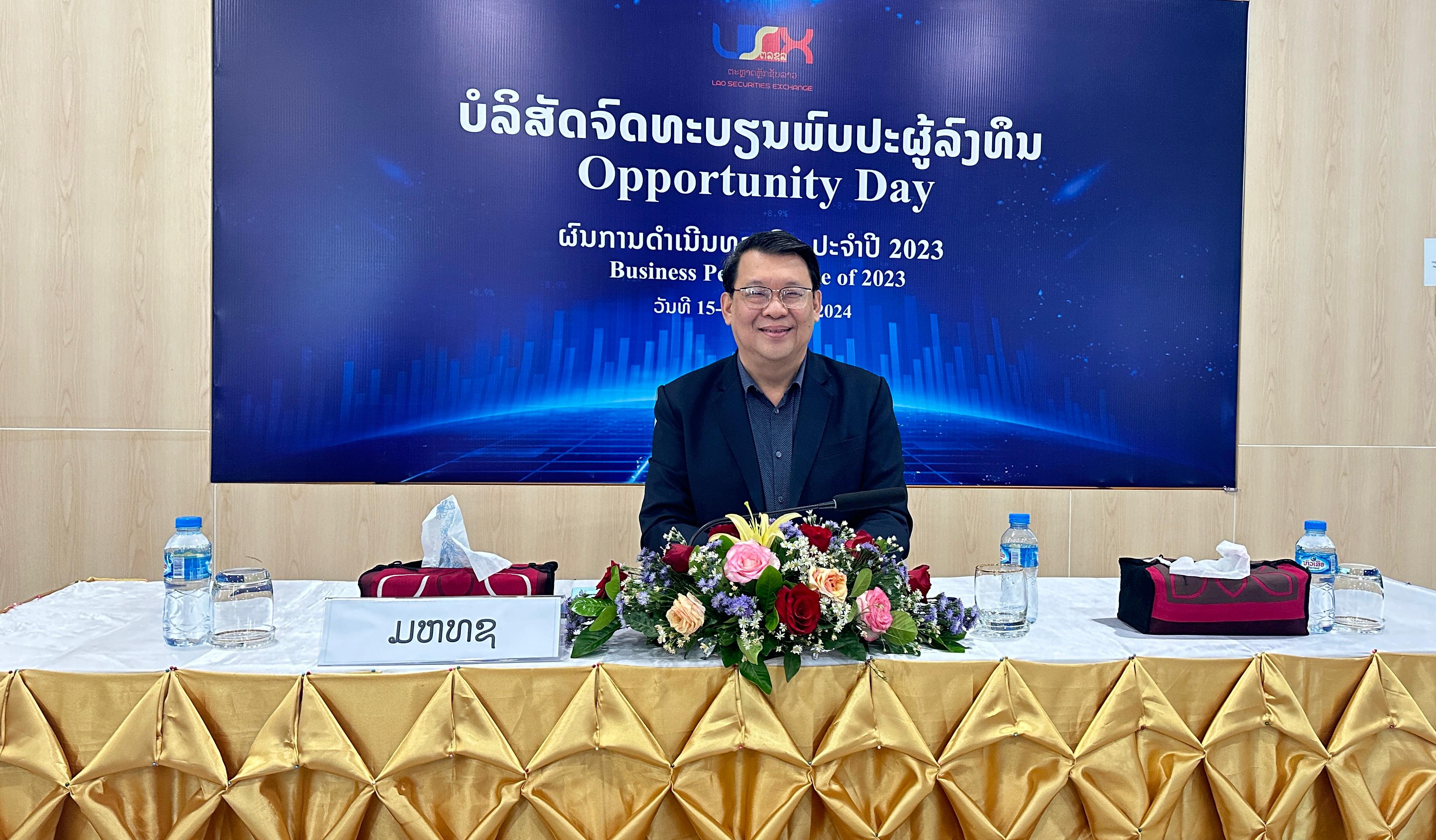 ທ່ານ ມານົບ ຕຣີລິດວິໄລ ຜູ້ອຳນວຍການ ບໍລິສັດ ມະຫະທຶນ ໄດ້ນຳສະເໜີ ຜົນການດໍາເນີນທຸລະກິດປະຈຳປີ 2023 ໃນງານສໍາມະນາ - ແລກປ່ຽນຄຳຄິດເຫັນ ພາຍໃຕ້ຫົວຂໍ້ “ບໍລິສັດຈົດທະບຽນພົບປະຜູ້ລົງທຶນ (Opportunity Day)” ປະຈຳປີ 2023