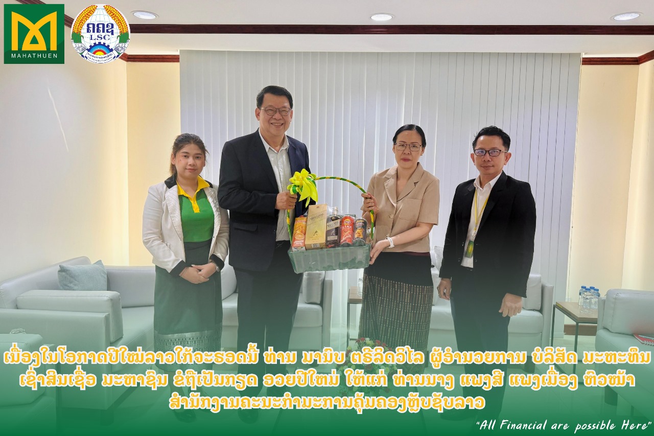 ເນື່ອງໃນໂອກາດປີໃໝ່ລາວໃກ້ຈະຮອດນີ້ ທ່ານ ມານົບ ຕຣີລິດວິໄລ ຜູ້ອຳນວຍການ ບໍລິສັດ ມະຫະທຶນ ຂໍຖືເປັນກຽດ ອວຍປີໃຫມ່ ໃຫ້ແກ່ ທ່ານນາງ ແພງສີ ແພງເມື່ອງ ຫົວໜ້າສຳນັກງານຄະນະກຳມະການຄຸ້ມຄອງຫຼັບຊັບລາວ